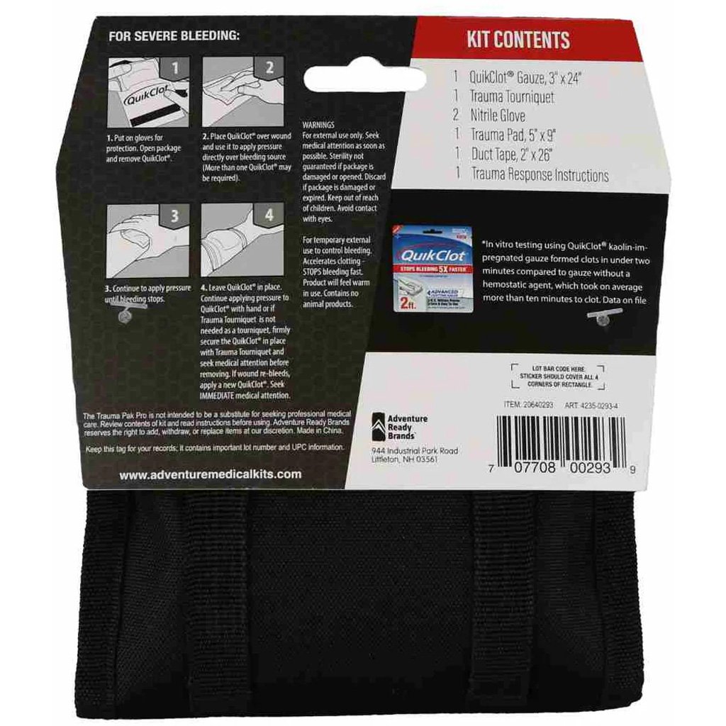 Features:Includes QuikClot Z-Fold Gauze (2 ft) with kaolin clotting agent;Includes trauma tourniquet with user instructions;Trauma pad (5″ x 9″) for wound coverage;Duct tape (2″ x 26″) for secure dressing or splinting;1 pair of latex-free gloves;Includes trauma response instruction sheet;Compact, lightweight design fits in BDU pocket;Designed for fast deployment in critical emergencies