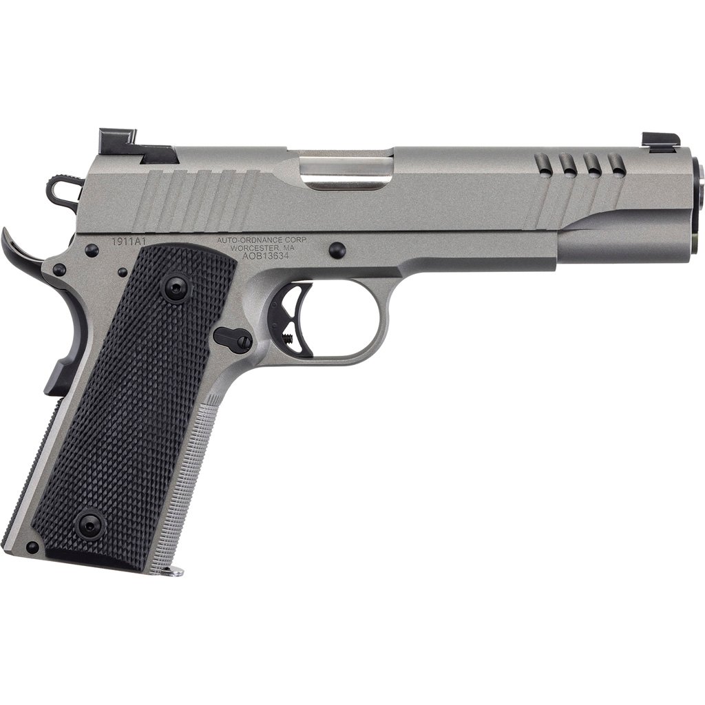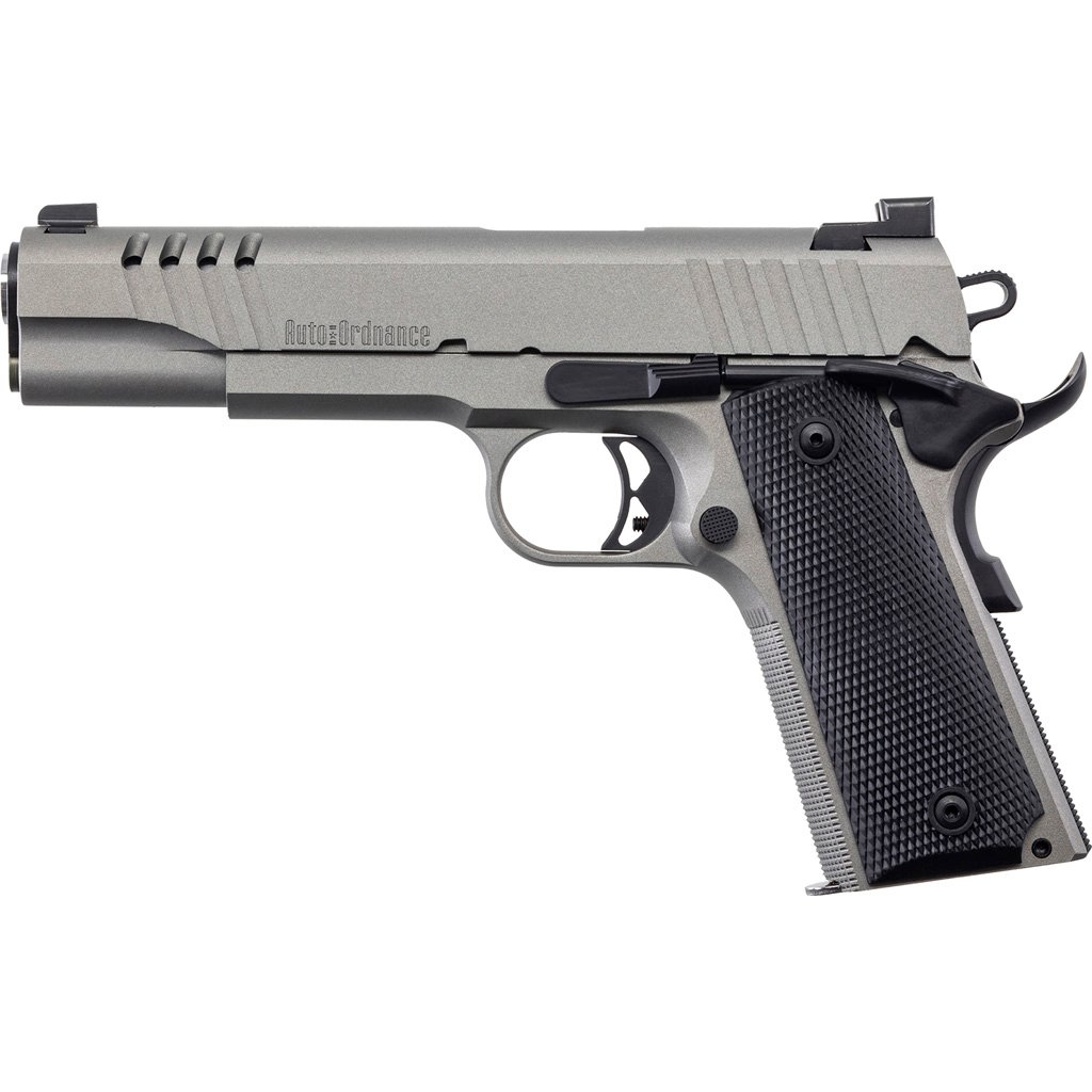 This American made 1911 It features an adjustable trigger, skeletonized hammer, full-length recoil guide rod, extended beavertail grip safety, and extended magazine release. The slide, sear, and disconnector are precision manufactured, then heat treated properly for durability over many thousands of rounds. The slide has decorative cuts, and front cocking serrations. Both mainspring housing and front strap are machined checkered at 20 lines per inch. The gun is finished in Savage Stainless Cerakote?. The match grade barrel is 5? in length, and chambered in .45 ACP. Grips are gray G10. The pistol has a thumb safety, grip safety, and firing pin block. Ships with one 7-round .45 ACP magazine.