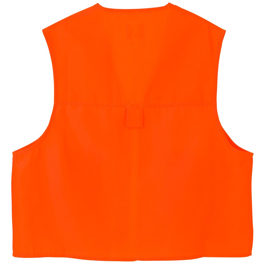 Blaze orange safety vest constructed of 100 percent polyester Oxford fabric. Features a zippered front, back license loop, large snap flap shell pockets and Buckmark embroidery on the front and back.