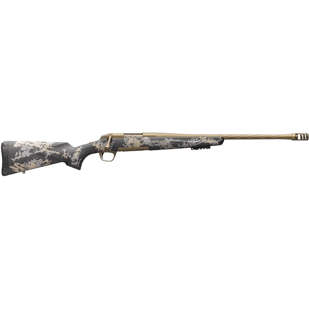 Features:Carbon fiber Camo stock;Cerakote Burnt Bronze finish on stainless steel barrel and action;Free-floated fluted barrel;Threaded muzzle brake with 5/8×24 threads is included;Bedded action;Short 60? bolt lift;Detachable rotary magazine;Three-lever Feather Trigger