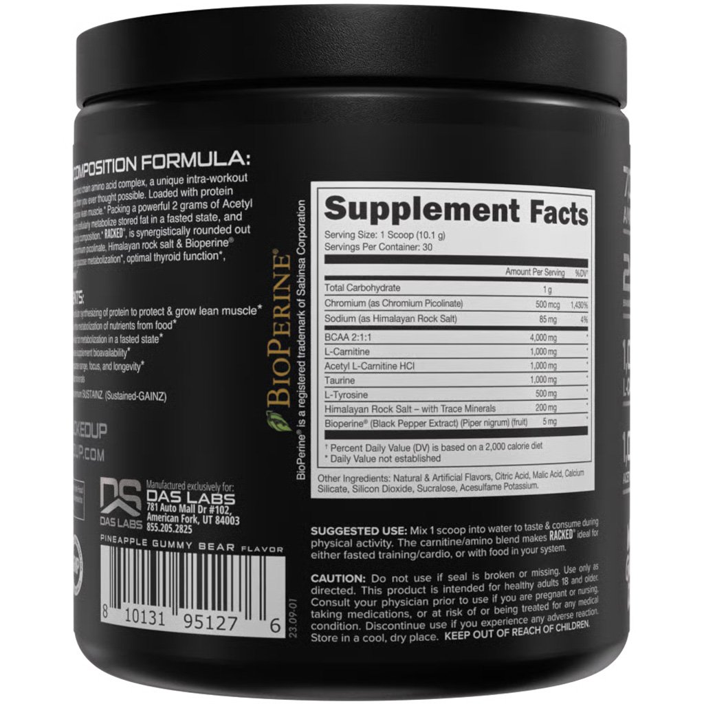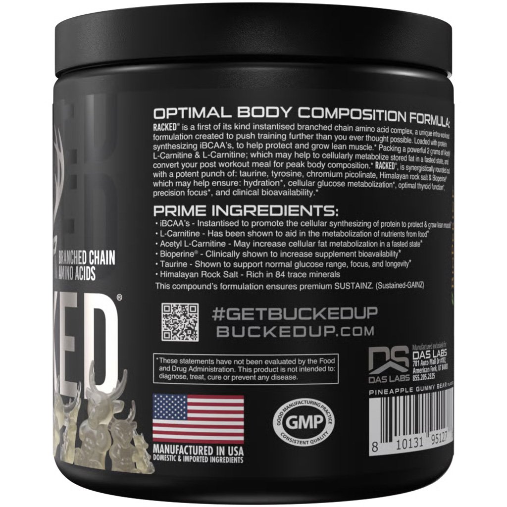 Bucked Up Racked BCAA is a high-performance branched chain amino acid complex designed to enhance muscle growth, recovery, and fat metabolism. Featuring a scientifically supported 2:1:1 ratio of instantized BCAAs, Racked delivers rapid amino support exactly when your muscles need it. This formula is further amplified with clinical doses of L-Carnitine, Acetyl L-Carnitine, and GBB to boost fat oxidation, promote energy, and intensify thermogenic effects?making it a potent fat-burning tool. Additional ingredients like Himalayan sea salt, taurine, tyrosine, and chromium picolinate support hydration, performance, and cellular energy optimization. With 30 delicious servings per tub, Racked BCAA is a powerhouse for athletes aiming to maximize every workout.