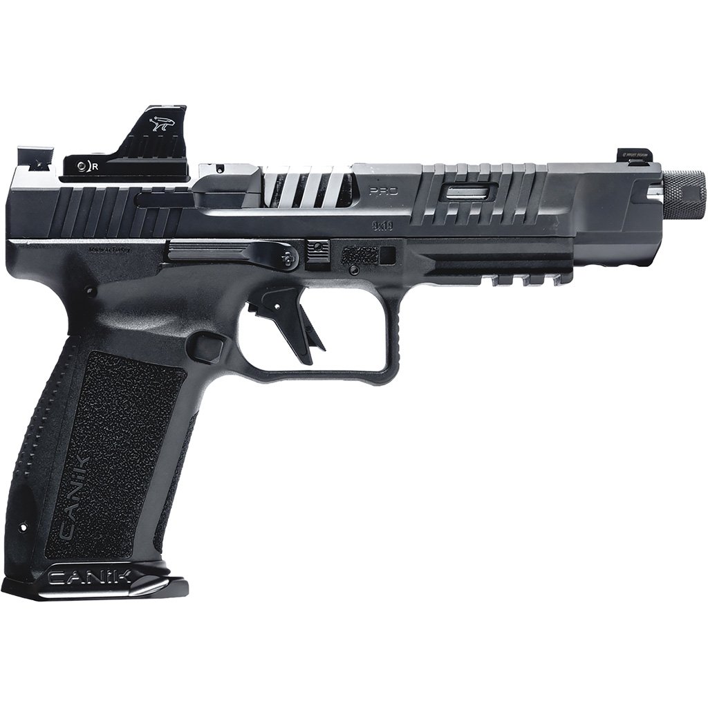Canik METE SFx Striker Fired Pistol 9mm 5.2 in. threaded barrel. Inlcudes MO1 Optic reflex sight. Black polymer frame and slide 20 rd. 3 dot sights. Reversable mag release. Flat faced trigger. Ambidextrous slide catch. Picatinny rail.