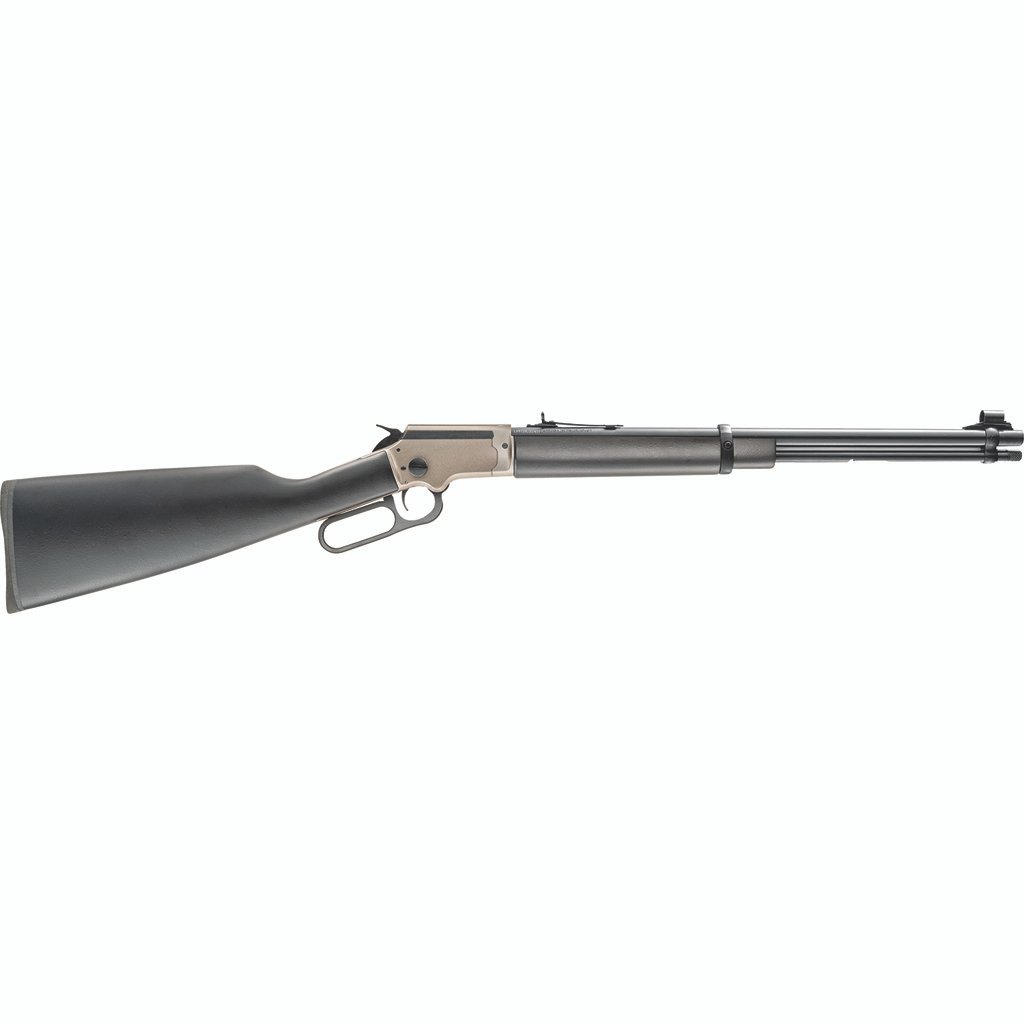 Chiappa LA322 Kodiak Cub Lever Action Take Down Rifle in 22 LR. The 18.5 in. blued barrel has adjustable semi-buckhorn rear sight and a tunnel type front sight with a tubular magazine that holds 15 rounds. The Cerakote receiver has a half cock safety and separates at the action for takedown with a straight black stock and lever.