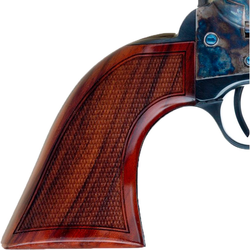 Designed for the sharpshooter who demands precision and reliability, this classic peacemaker-style revolver boasts a distinctive wide square-notch rear sight paired with a wide constant front sight for unparalleled accuracy. The slim checkered grips provide a secure and comfortable hold, ensuring a better fit and enhanced control. Crafted by Cimarron’s master gunsmiths, the revolver features fine-tuned internal components, including a competition hammer and trigger/bolt springs, to deliver a light, smooth action, and a crisp/clean trigger pull. The pre-war frame and standard hammer underline the revolver’s traditional appeal. Ideal for the competitor who values aesthetics and performance in a shooting instrument.
