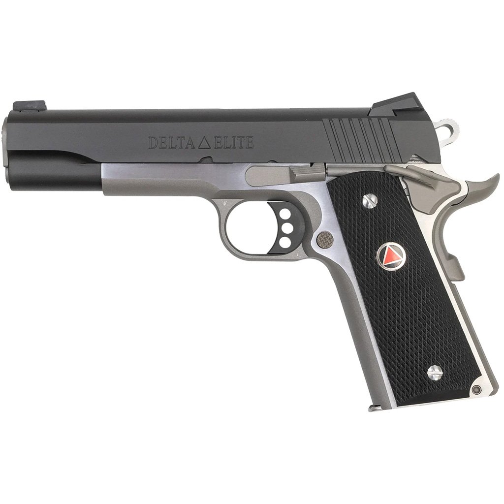 The Colt 1911 Delta Elite combines iconic 1911 styling with the power of 10mm in a rugged, stainless steel package. Featuring a 5-inch barrel and Novak fixed sights, this single-action pistol delivers accuracy and reliability for defensive or recreational use. A black DLC slide, upswept beavertail grip safety, extended thumb safety, and skeletonized hammer enhance control and comfort. With a capacity of 8+1 rounds and a durable black composite grip, the Delta Elite balances power and precision in a classic platform.