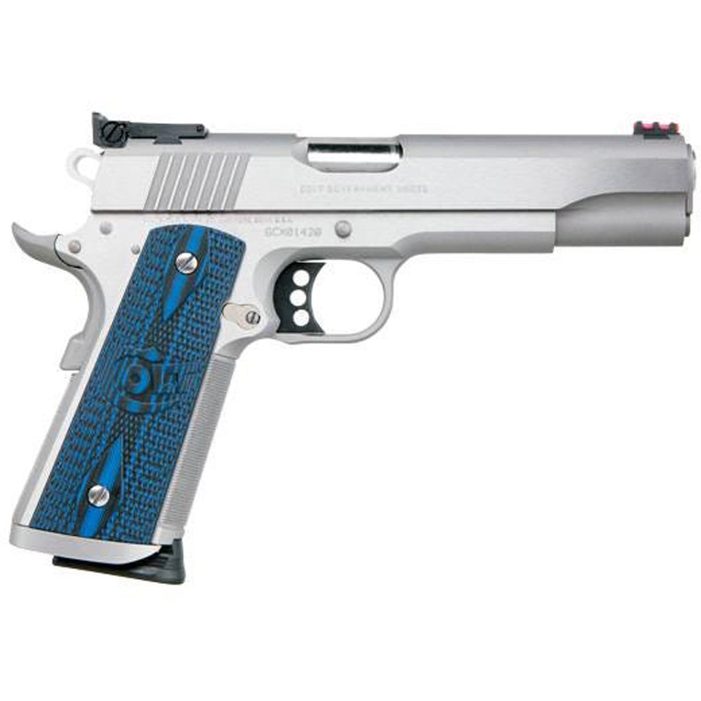 Features:Chambered in .38 Super;5-inch National Match barrel;Single-action operation;Stainless steel frame and slide;Adjustable Bomar rear sight with fiber optic front sight;G10 checkered blue grips for enhanced control;Series 70 firing system for a clean trigger pull;9+1 round capacity