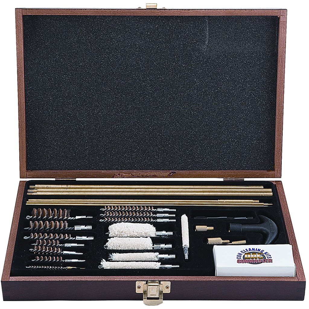 Features:35-piece;The cleaning kit contains rods, brushes, jags, patches, mops, adapters and more to fit pistols, rifles and shotguns.;Wooden storage case