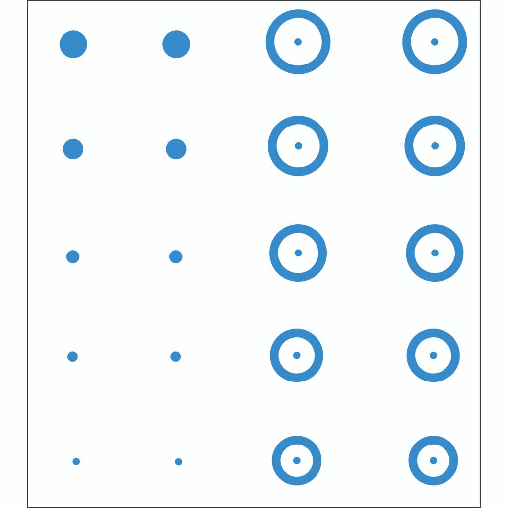 Chubby Target Set features 5 different sizes of reticles, 2 each and a total of six different sizes of dots, 25 dots total. Reticle wall is thicker than precision target set for better point of interest isolation, generally used by spot shooters.