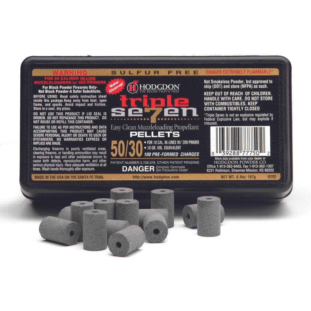 These 50-caliber, 50-grain pellets are designed for use in 50-caliber, in-line rifles. Use a single pellet for target or small game, two pellets may be used to create a 100-grain equivalent for large game. These sulfur-free pellets provide easy clean-up, just like Triple Seven granular powder. Designed for 209 shotshell primers only.