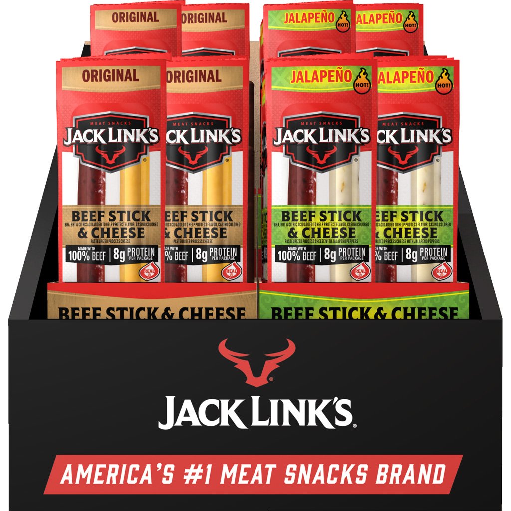 Features:Includes: 64 combo packs;Flavors: Original and Jalape?o;Weight: 1.2 oz per pack;Ingredients: Made with 100 percent premium beef, contains real Wisconsin cheese;Pairing: Meat and cheese stick;Packaging: Portable, individually wrapped;Use: Great for convenience stores, breakrooms, or on-the-go snacks;Packaging: Comes in counter display packaging for easy access