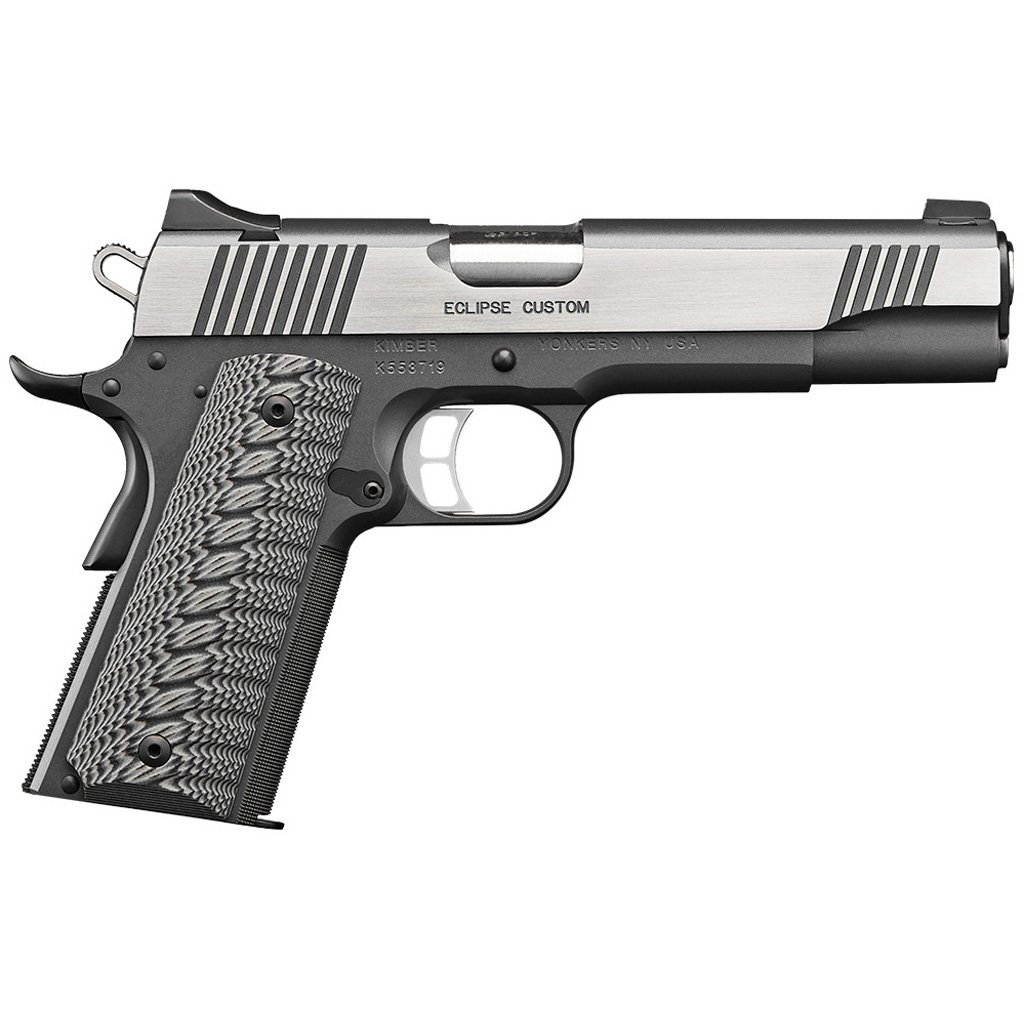 Kimber Eclipse pistols have a striking brush-polished finish and special Custom Shop features, including 30 lines-per-inch front strap checkering and a Premium Aluminum Trigger. It has a two tone Stainless slide and Charcoal Gray frame with G-10 grips.