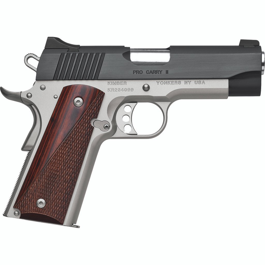 The Pro Carry II is a hallmark of Kimber quality, complete with a brush-polished carbon slide, aluminum frame and smooth/checkered rosewood grips.