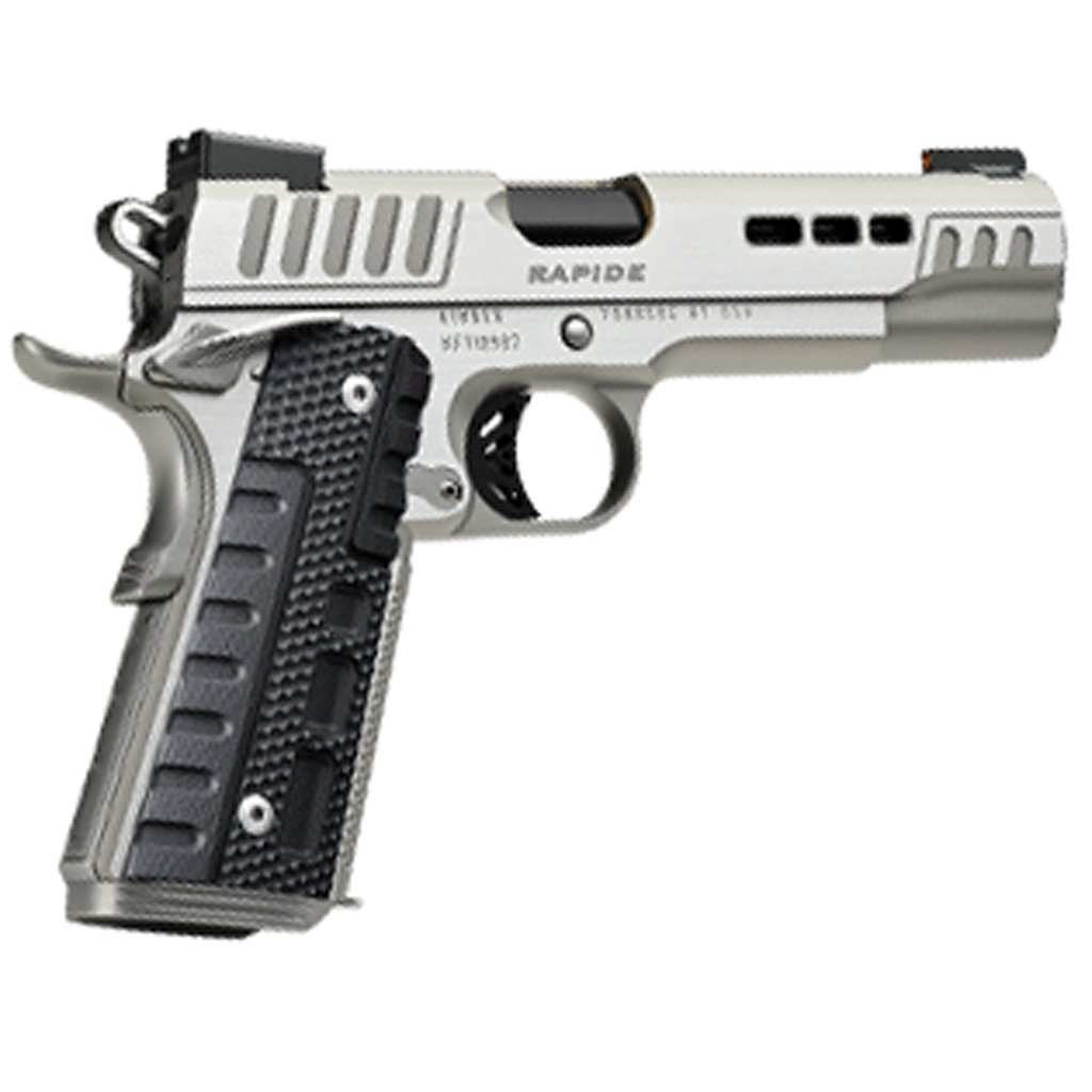 The RAPIDE (Frost) (DN,NS). A truly unique 1911 with stepped cocking serrations, slide lightening cuts for faster Slide lock-up and DLC coated barrel for extreme durability. Equipped with Kimber Stiplex TM front strap stippling and Black G10 Rapide patterned grips for extra griping confidence. Kimpro Silver finish with brush polished flats finish off the stunning looks.