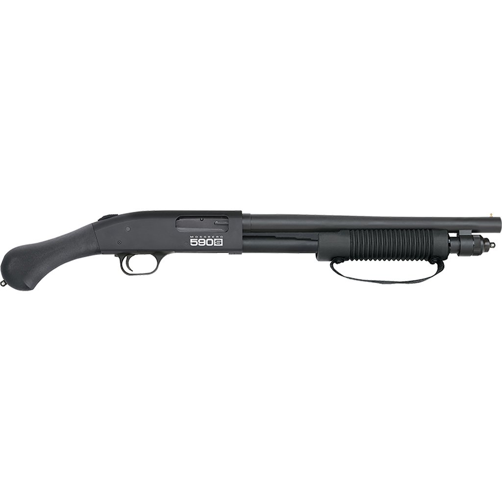 The 590S Shockwave features a 3? chamber capable of firing 1.75? short shell, 2.75? and 3? shells. This pump-action shotgun comes with a cylinder bore choke installed. Additional features include a Raptor grip with corn-cob forend and strap and bead sight.