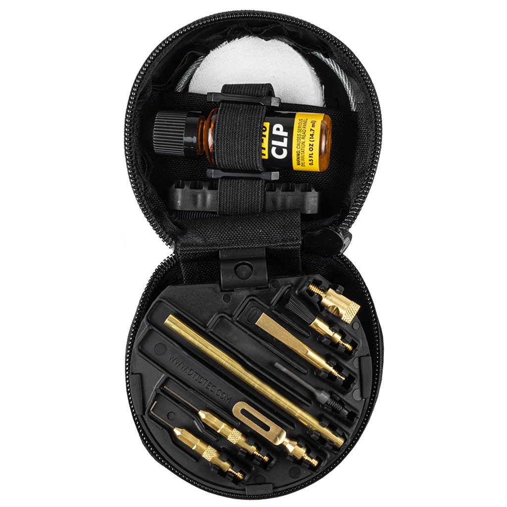 This cleaning kit contains a variety of components to clean pistols in the most common calibers. Includes round, cotton patches in 2? and 3? sizes. Four bore brushes are included for .22 cal, .38 cal/9mm, .40 cal & .45 cal. The obstruction remover gets rid of stubborn debris and doubles as a t-handle base for the included female rod handle. The 8? and 12? Memory-Flex cables provide proper cleaning from the breech to muzzle (slotted tip permanently affixed on 8? cable). Pin punch, end brush, scraper, straight & bent pick, short AP brush for precise cleaning. Also includes chamber flag, 0.5 fl. oz. Shooter?s Choice FP-10 Lubricant Elite CLP & instruction manual. Items are packed in a 4?x4?x2.5? soft pack case. Made in the USA.