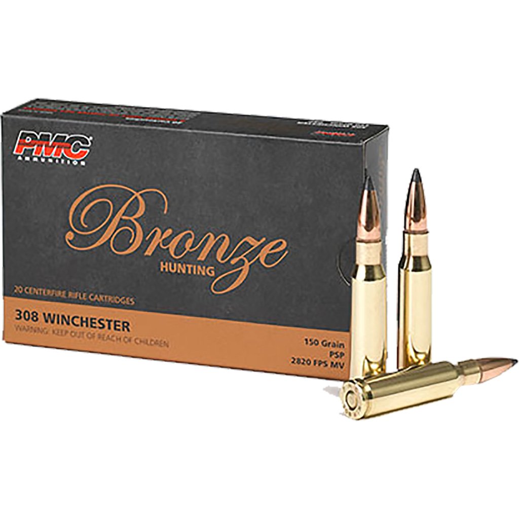 This PMC 308 Winchester ammo features 150 grain soft point bullets, a boxer primer that is non-corrosive and new never fired brass casings that can be reloaded several times for those high volume shooters that love to reload their 308 Winchester ammo. PMC 308 Winchester 150 Grain Soft Point ammo offers muzzle velocity of 2820 feet per second and muzzle energy of 2648 ft. lbs. This Bronze line by PMC is new production, non-corrosive, in boxer primed, reloadable brass cases. PMC Bronze Line offers reliable performance for every shooting application, from plinking to target shooting to hunting. This popular Bronze line makes it possible for budget-conscious hunters and shooters to go into the field or to the range with plenty of ammunition without breaking their banks.