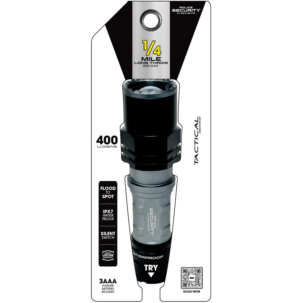The Police Security Long Throw 400 Lumen Flashlight delivers exceptional long-range illumination, reaching up to a quarter mile (410 meters) with powerful 500-lumen brightness. Featuring a twist-focus function, it allows for precise beam adjustments, making it ideal for wide-open spaces, fields, and outdoor exploration. Designed for rugged durability, this flashlight is impact-resistant and IPX7 waterproof, ensuring reliability in harsh conditions. Powered by three AAA alkaline batteries (included), it provides up to 6 hours of runtime on low mode. With a roll-stop design to prevent accidental rolling, this flashlight offers dependable performance for any adventure.