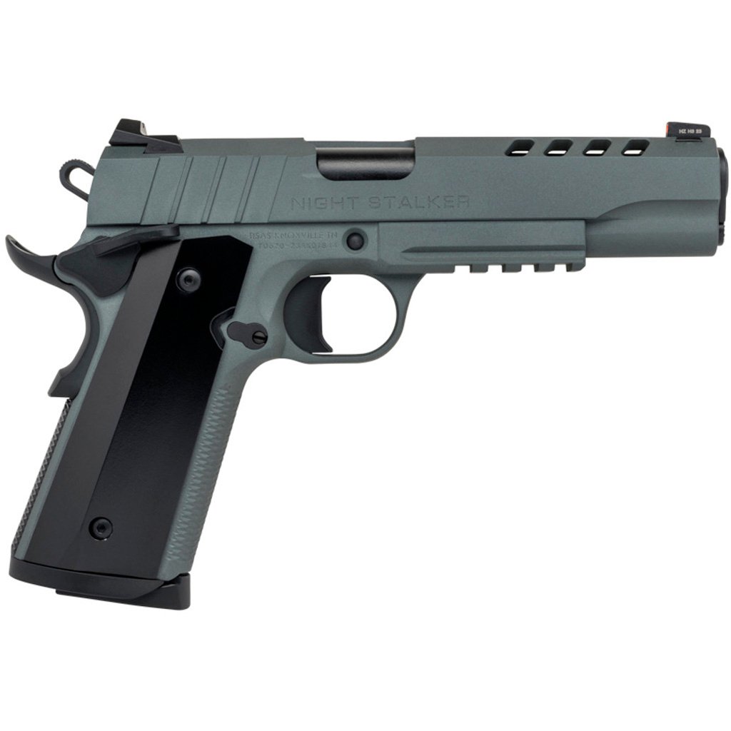 The Nightstalker is a full-size 1911 pistol with an integrated picatinny rail that comes from the factory with a long list of features that include a skeletonized hammer, SF trigger and ambidextrous safety, extended beavertail grip safety, aluminum grips and rear slide cocking serrations. Built on our forged frame and slide for durability with our cold hammer forged barrels for accuracy, the Nightstalker 1911 is ready for whatever comes at you.