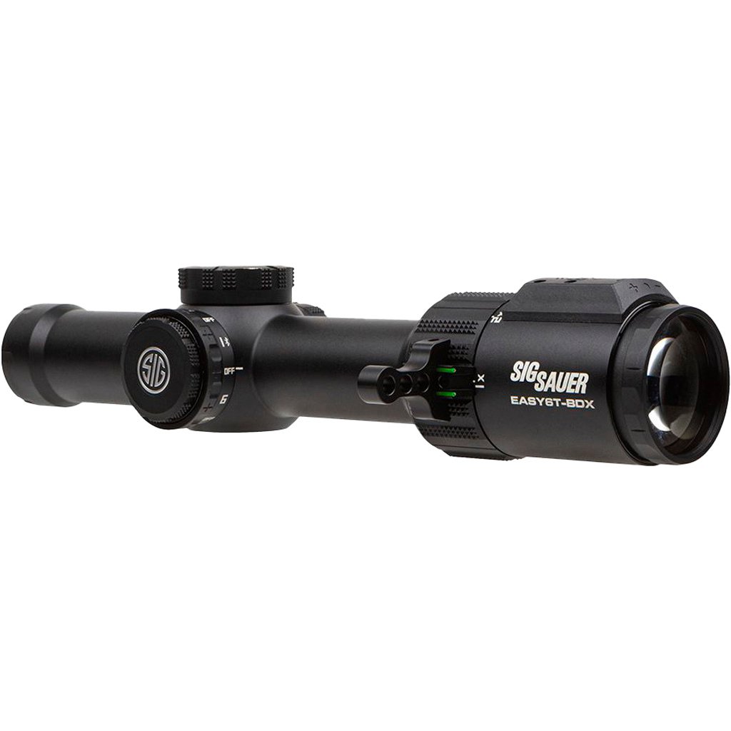 The Sig Sauer Easy6-BDX Scope boasts a 1-6x24mm BDX-R2 digital reticle. With a 30mm main tube diameter, it allows for a wide field of view and rapid target acquisition. The scope comes equipped with BDX 2.0, an onboard system with SmartBDC, providing nine ballistic groups that adjust automatically with magnification changes. Its reticle, with 194 LED hold points, pairs with KILOBDX Laser Rangefinders for real-time range adjustments. The Easy6-BDX offers up to 95% light transmission, adjustable parallax, and a total of 37 MRAD in elevation and windage travel, ensuring precise shots in various conditions.