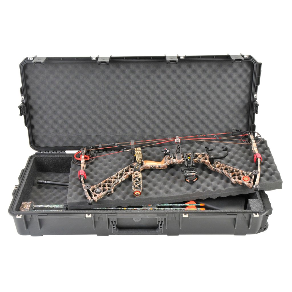 Injection molded watertight double bow case features a rigid foam bunk-bed system for secure storage of 2 parallel limb bows or a combination of a bow and rifle. Includes inline skate wheels, reinforced padlock holes, and three cushioned carrying handles.