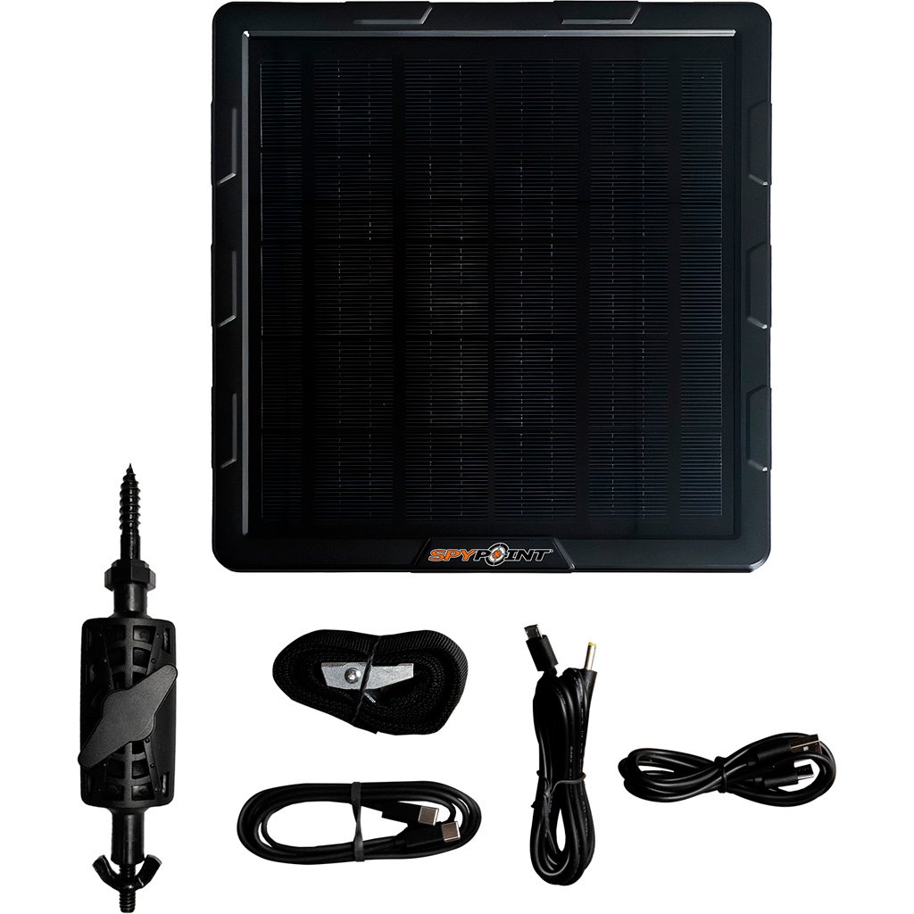 Features:5W max power for efficient charging;7500 mAh capacity for extended use;Solar panel with charge indicator LEDs;IP65 waterproof for durability;Compatible with all Spypoint cameras;Flexible mounting arm for easy installation;Includes 1.5 m arm cable and installation straps