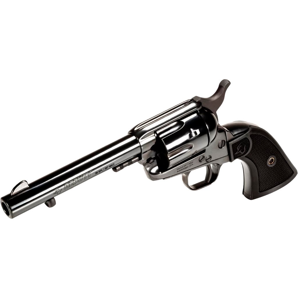 The Taurus Deputy is a single-action revolver that echoes the design of the traditional single-action army. It comes with a blued finish, black polymer grips, and a fixed front blade sight coupled with an integral rear notch sight. Each model has a six-round capacity and includes a steel frame with a transfer bar for added safety. Available with barrel lengths of 4.75 inches or 5.5 inches, the Taurus Deputy can be chambered in either .45 Colt or .357 Magnum, accommodating different preferences while maintaining consistent quality and functionality across models.