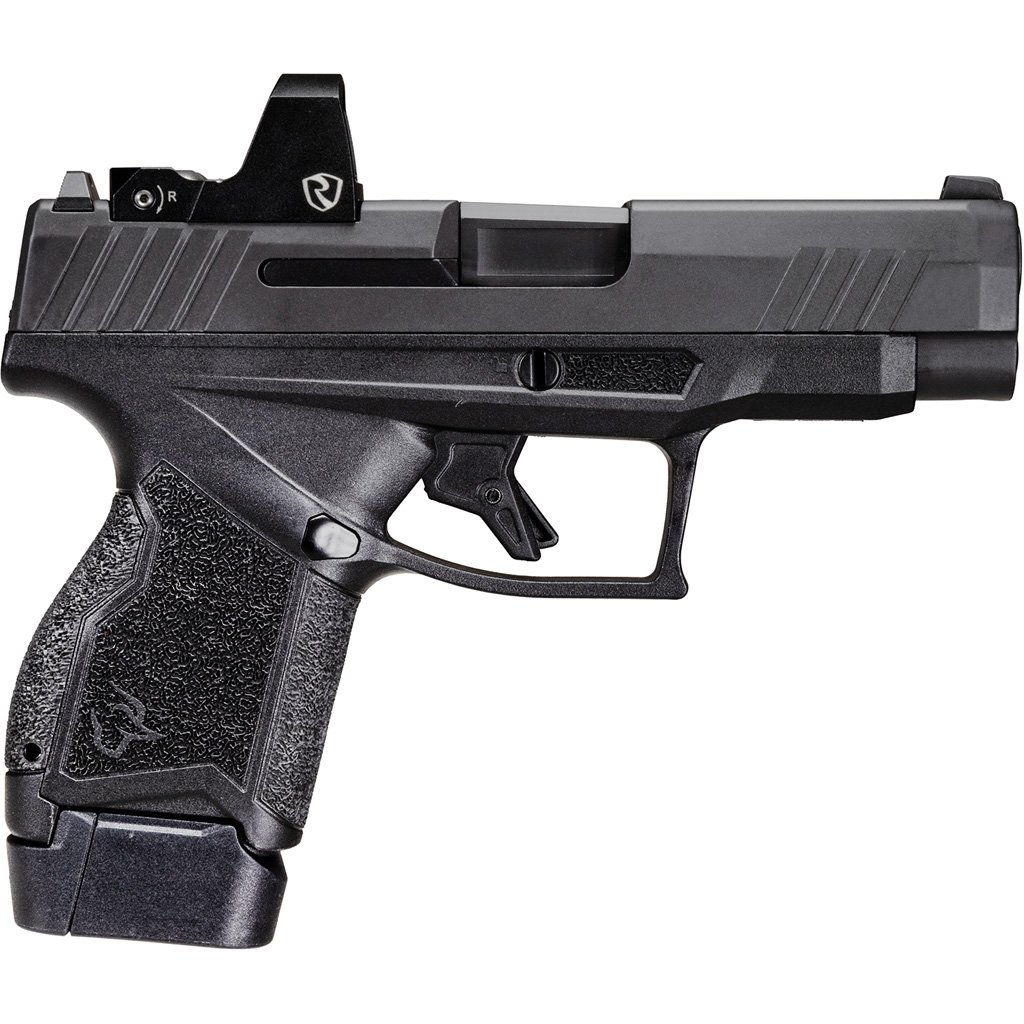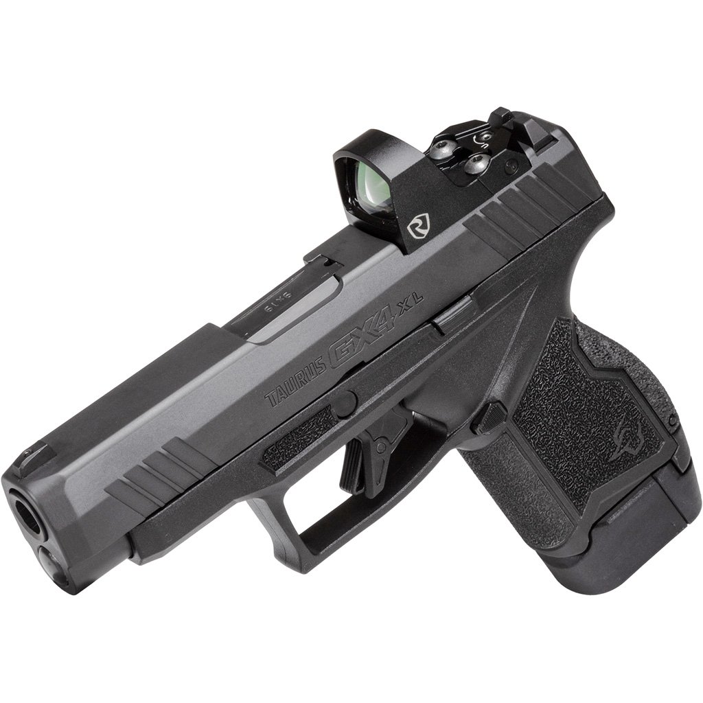 Longer slide adds 1 inch of length when compared to the GX4?increasing muzzle velocity and sight radius, making it easier to maintain accuracy. T.O.R.O. (Taurus Optic Ready Option) slide. Direct thread, no plate system accommodates today?s most popular red dot optics. A DLC coated stainless steel barrel ensures reduced friction and greater wear and corrosion resistance no matter the elements. Standard backstrap profile features a slight palm swell. Those who favor a higher wrist position for natural point-of-aim can install the included high-swell backstrap. 11- or 13-round magazine options for increased versatility and added peace of mind. A blackout steel serrated drift adjustable rear sight and fixed (white dot) front sight promote fast target acquisition when not running a red dot. Flat faced target trigger delivers accuracy and predictability courtesy of its crisp, precise sear break and the pleasingly short and tactile reset that is fundamental to quick, on-target follow-up shots. Carry-friendly carbon steel slide boasts a gas nitride coating to maximize slide surface hardness that shooters can depend on in any application.