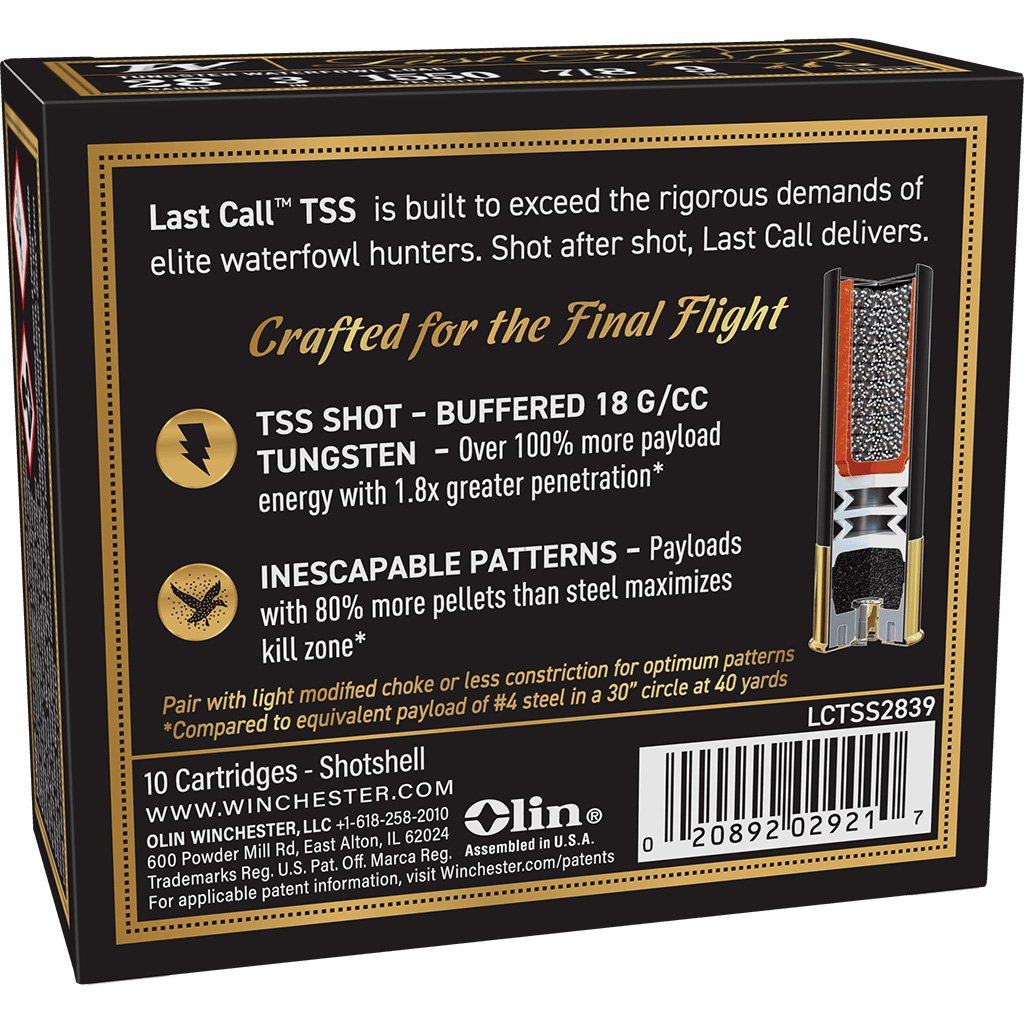 Winchester Last Call Waterfowl TSS Load in 28-gauge is engineered for serious hunters who demand extreme performance in a compact shell. This 3-inch load contains a 7/8-ounce payload of #9 TSS tungsten shot, delivering over 100 percent more payload energy and 1.8 times the penetration compared to steel. The 18 g/cc density tungsten produces payloads with 80 percent more pellets than steel, ensuring devastating, inescapable patterns. With a high muzzle velocity of 1550 fps, this load excels in lethality and range, particularly when paired with light modified or similarly constricted chokes. Compact yet powerful, it offers elite waterfowl performance in a 28-gauge platform.